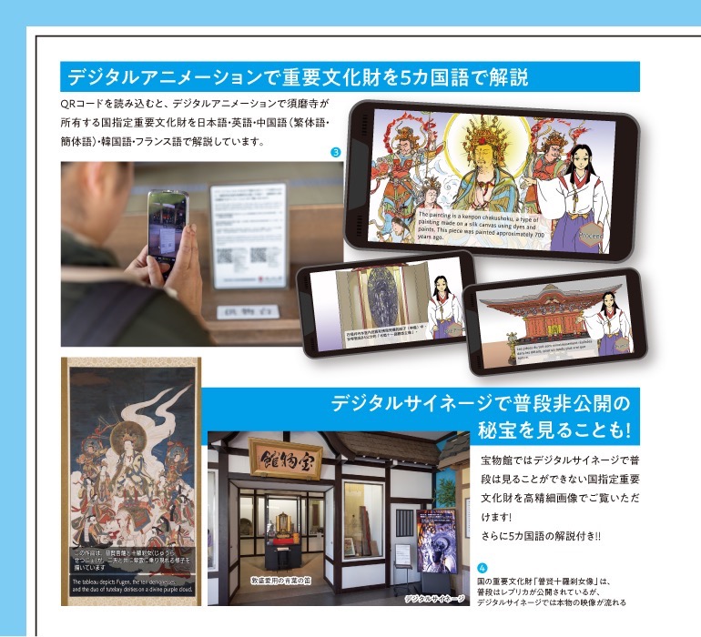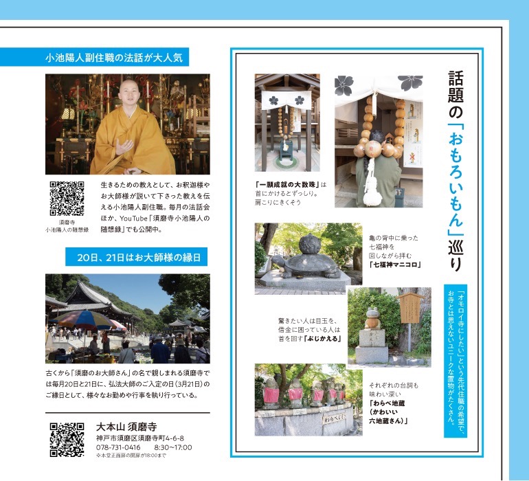 16歳の美少年、平敦盛(たいらのあつもり)が一ノ谷の浜辺で源氏の武将・熊谷直実に討ち取られた話は平家物語の中で最も美しく、最も悲しい物語として有名。その敦盛の首が埋葬されているのが、ここ須磨寺だ。仁和2年(886年)に建てられた真言宗須磨寺派の大本山で、正式名は上野山福祥寺(じょうやさんふくしょうじ)という。敦盛首塚をはじめ、敦盛愛用の青葉の笛や弁慶の鐘、義経腰掛の松など、多数の重宝や史跡があり、「源平ゆかりの古刹」として知られる。青葉の笛などが常時展示される宝物館には、文化庁の多言語化事業でデジタルサイネージを設置。日本語を含む5ヶ国語で「本堂内宮殿と仏壇」「木造十一面観音立像」「普賢十羅刹女像」の重要文化財の映像作品を見ることができる。また境内にあるわらべ地蔵や音が鳴る仕掛けの石碑など「おもろいもん」巡りもSNSなどで話題に。お寺の敷居の高いイメージを払拭し、多くの人に「笑顔でお参りしてほしい」と設置されたユニークな置物の数々。参詣のお楽しみにぜひ!