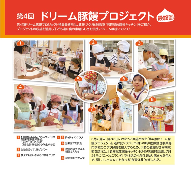 ドリーム豚饅プロジェクトでは、コラボ豚饅の売上を、未来を担う子ども達への“食育事業”に活用。食を通じて、神戸の食文化と子ども達の未来を育てていく取り組みを行っています。今回は48名の募集枠に1111名(←偶然にも豚饅の日11月11日と同じ数字の並び)の応募があり、抽選で選ばれた小学生達と有意義な時間を過ごせました。参加者のなかには「自主学習」としてお店の歴史や商品について予習をしてきてくれた子もいて、各々の学びの機会に繋がっていることを嬉しく思います。「自分で作ると美味しい」「作るって楽しい」に気づき、「おうちでも作りたい」「次は竹輪を入れてみよう!」など、意欲&創造力あふれる子ども達に毎回、刺激を受け、私たち自身も学びの場となっています。