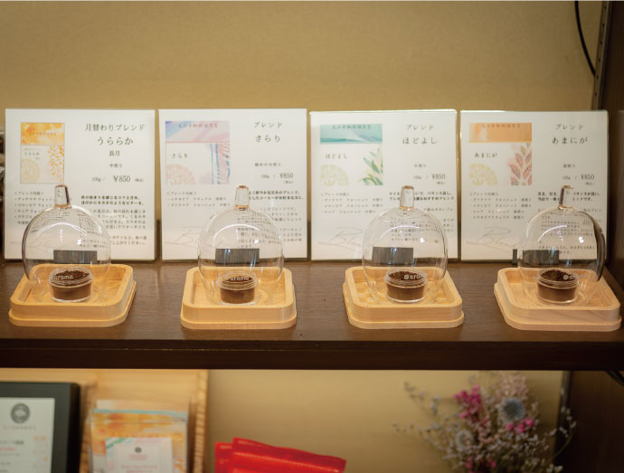 ❸オリジナルブレンドは「さらり」「ほどよし」「あまにが」の定番と月替わり「うららか」