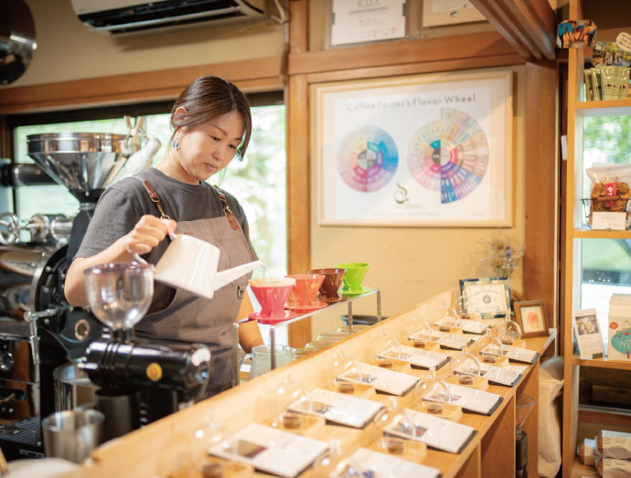 太山寺の参道添いにあるスペシャルティ珈琲豆専門店。趣ある古民家で自家焙煎した珈琲豆とテイクアウトドリンクを販売する。「実は僕、珈琲が苦手だったんです」と笑うオーナーの横野貢司さん。だからこそ生産者が情熱を注いで栽培した最高品質の豆を厳選して仕入れ、鮮度にこだわって必要な分だけ焙煎して提供。珈琲は嗜好品ではなく、毎日飲みたくなるものとの想いから奇をてらわず、日常に合う一杯を追求する。店内では地元店のスイーツやパンも販売し、それらを主役に珈琲をあわせるのもウエルカム。本気だけど、ゆるく&楽しく選べる珈琲の魅力にハマるファンが多数。