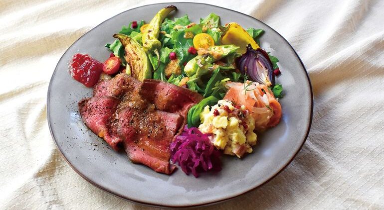 食べる植物園プレート」パンビュッフェ付き1,980円。国産牛のローストビーフと季節野菜のグリルやスモークサーモンなど一皿に美味がたっぷり