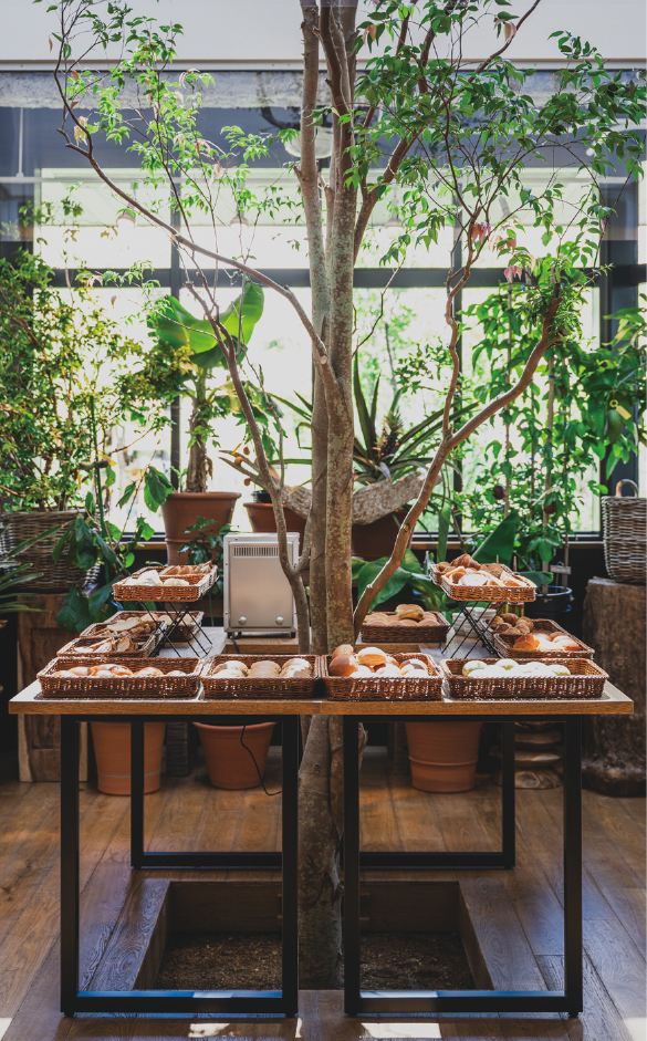 「味わう体験」を提供する1階のレストランでは神戸市西区にあるナチュラリズムファームの有機野菜や淡路島の玉ねぎなど旬の野菜を使ったごちそうプレートやパスタなどを提供。おすすめの「食べる植物園プレート」は、ガーデンの果物やハーブで作った自家製ジャムが添えられたローストビーフをメインに、有機野菜や旬の美味がてんこ盛り。各素材に適した調理法でそれぞれの滋味を引き出すほか、ポテトサラダのラベンダービネガー添えなど、レシピのセンスの良さに気分も爆上がり。ランチタイムには、併設する「みなとやまベーカリー」の焼きたてパンがビュッフェ形式で登場するのも嬉しい。