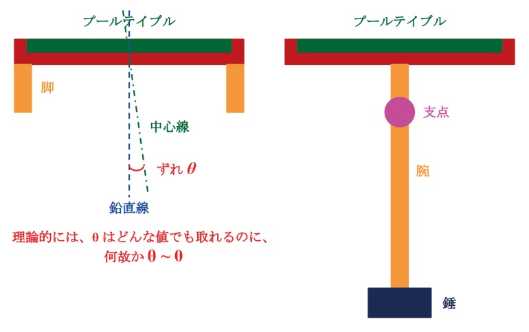 ここに、誰が置いたかわからないプール・テイブル(ビリヤードをする台)があります。これが宇宙、あるいは宇宙の仕組みを表わすものとします。ビリヤードの球が勝手に転がり出してはいけないので、通常、プール・テイブルは水平に置かれています。しかし、このプール・テイブルを調べたところ、人間では不可能なほどの精度でぴったり水平に置かれているのです。をを神よ!と宗教家なら叫んで終わりかも知れませんが、物理学者は神に頼らずにその理由を考えるのです。そこで考え出したのが、このプール・テイブルが、図の右のように、振り子のようになっているのではないか、ということです。理論物理学者がそのような考え(理論)を出したら、本当にそうなっているのかを調べるのが実験物理学者の仕事です。みなさんだったらどう調べますか。僕ならゆすってみます。振り子ならゆれるはずです。そして、この「ゆれ」こそが、アクシオンという粒子そのものなのです。シキヴィエ氏は、実際に研究会でお逢いしたことがありますが、とても上品な方ですので、せっかくのプール・テイブルなので、ここでビリヤードをしてみる、とのことでした。すると、球がクッション(プール・テイブルの端)に当たった反動で、テイブルがゆれるだろう、というわけです。これが、加速器を使ってアクシオンをつくり出す実験です。この実験は、ペッチェイ・クイン理論が発表されてからすぐに行われましたが、結局、アクシオンをつくり出すことはできませんでした。では、振り子構造ではなかったのか。物理学者はそうは考えませんでした。ではどう考えたのか。振り子が長すぎて、ビリヤードの球が当たったくらいではゆれなかった、との結論に達したのです。振り子の長さはアクシオンの質量に反比例し、つまり、振り子がとても長いということは、アクシオンがとても軽いことを意味します。加速器でつくり出すには軽すぎたのです。実際、アクシオンが「冷たい暗黒物質」であった場合には、なんと電子の一〇〇〇億分の一ていどの質量であると考えられています。他の素粒子と比べて、文字通り桁違いの軽さです。
