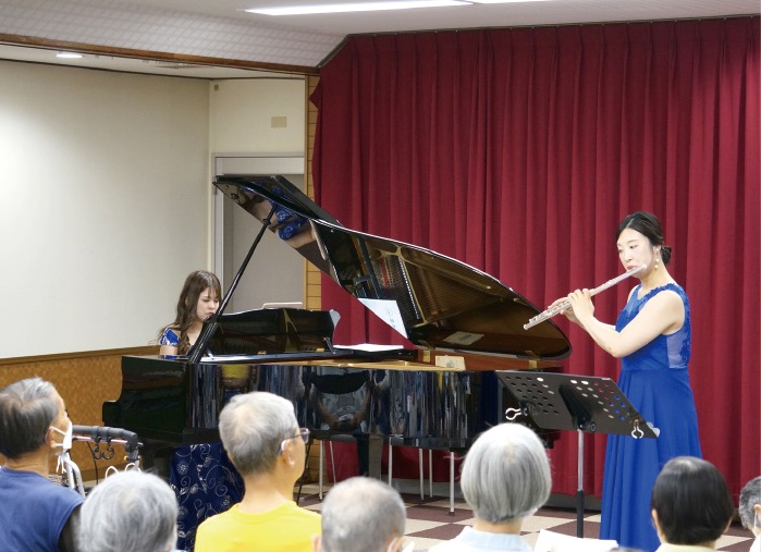 続いておこなわれたコンサートでは、フルートの窪田香織さん、ピアノの勝部藍里さんが、涼やかなブルーのドレスでヨハン・シュトラウスの「美しく青きドナウ」、シューマンの「ライン」、スメタナの「モルダウ」など川に関するクラシックの名曲をまさに流れるように奏で、田辺先生が曲や作曲家を歴史的背景を交えながら紹介。最後はアメリカ民謡「赤い河の谷間」を会場全体で和やかに歌って終了、かと思いきや、アンコールで美空ひばりさんの生前最後の曲「川の流れのように」が。その美しい旋律が心の琴線に触れたのか、「ゆるやかに いくつも時代は過ぎて」と、歴史や人生と重ね合うように歌う声がどこからともなく響いた。