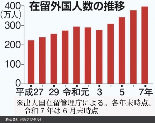 出入国在留管理庁の最新資料によれば、日本に在住する外国人数がコロナ禍の時期(令和3年)を除いて一貫して増加しています(図を参照)。令和7年6月末時点で395万6619人。これは静岡県の全人口、奈良県と京都府を合計した人口にほぼ相当し、日本の全人口(約1億2千万人)の約2・9%を占めます。この数字の多寡の議論よりも、その内実が重要と考えられます。