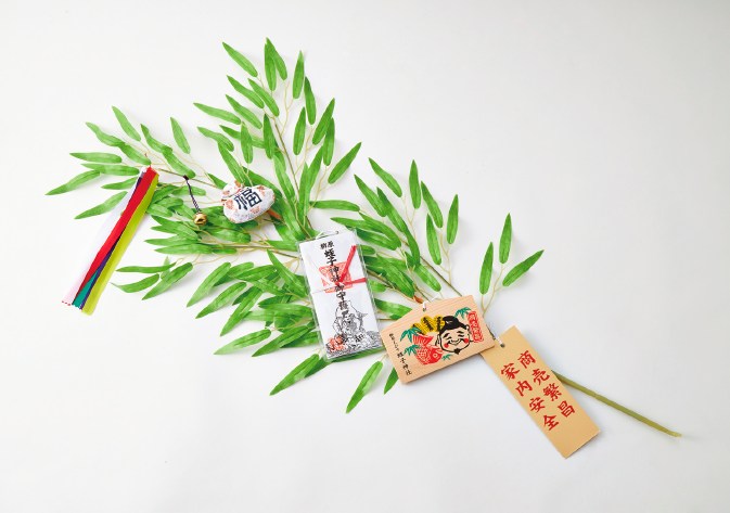 十日えびす大祭で授与される、家内安全・商売繁盛の「福笹」。多数の縁起物(吉兆)がつけられている