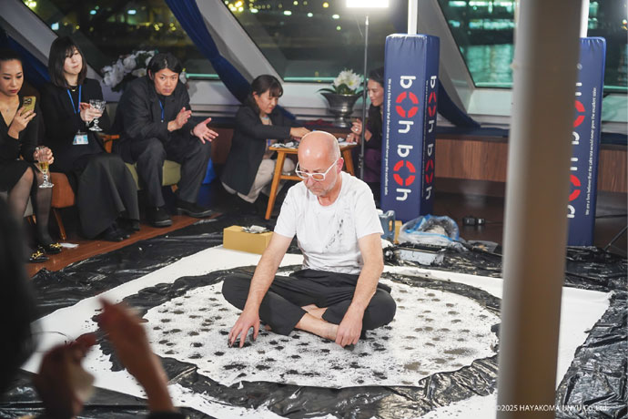 会の後半は来場者の更なる「縁」を深めようと場所を「boh boh KOBE」船上に移し、クルージングパーティーが開催された。食事は佐々木佑輔氏(Echo 二子玉川)が手掛け、隧の“豊かさ”を、秋の味覚と融合させ鮮やかに表現。さらにチェコ出身アーティストVIT KODOUSEK氏による「一期一会」をテーマにしたパフォーマンスが披露された。その場を共有する人だけが、この場所でしか出来ない体験をする、というまさに「ご縁」を視覚的に表現した素晴らしい空間となった。