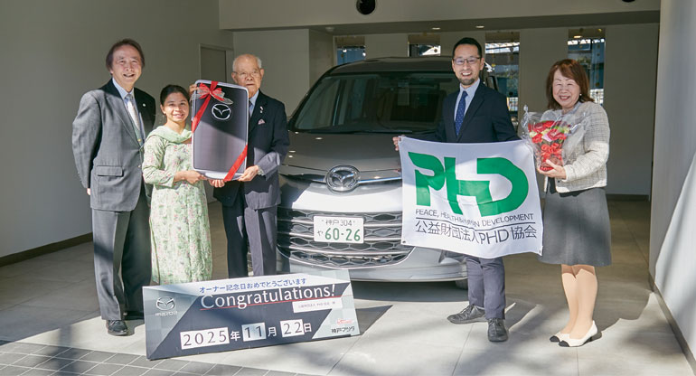 神戸マツダでは、これまでに車両の贈呈を行ってきたが、11月22日には8名乗りのマツダビアンテを寄贈した。PHD協会の水野雄二理事長は、「研修や食料の運搬などに車両は欠かせない。協会として大切に使用したい」と感謝を述べた。