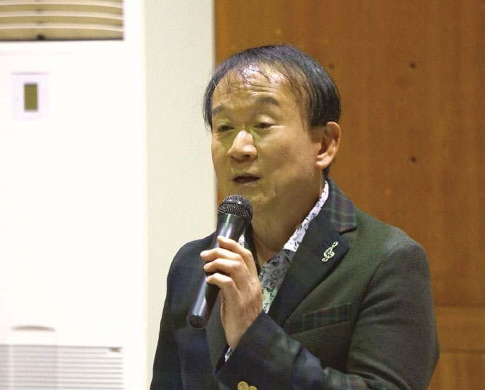 続いて「しあわせ運べるように制作の経緯」をテーマに臼井先生が動画を交えながらお話を。震災で自宅が全壊したこと、避難先の親類宅で思い出の場所がズタズタになった映像を観て、その辺の紙に思いを書き記し「しあわせ運べるように」が誕生したこと、震災から1か月ほど後に被災者やボランティアの前で電子ピアノを弾いて教え子たちと歌ったことが初披露だったこと、それから30年の時を経てあの時と同じ場所にて同じ電子ピアノで伴奏して40代になった教え子たちと再び歌ったことなど、さまざまな秘話を披露。「しあわせ運べるように」について「奇跡のように未だに歌が生きています。この歌を通じ亡くなった方に心寄せていくことが私の使命です」と語ると、観衆の目頭も熱くなった。