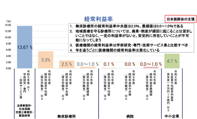 出所/※1中小企業庁「中小企業実態基本調査(令和5年度決算確報)」(令和7年7月30日)*中小企業実態基本調査に医療機関は入っていない、※2 厚生労働省 第120回社会保障審議会医 療部会(令和7年10月27日)資料2-2「医療法人の経営状況(R7.8月末時点速報版)」、※3 財務省「年次別法人企業統計調査(令和6年度)」(令和7年9月1日)