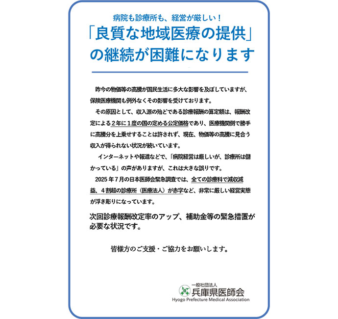 八田 2025年度までの地域医療構想は病床の削減など病院のことが主でしたが、2027年度からの新たな地域医療構想は2040年に向けてより地域にフォーカスした内容になっています。県内には8つの二次医療圏があり、それぞれの医療圏へ定期的に訪問していますけれど、2026年はもう少し細かいところ、例えば播磨姫路医療圏でしたら姫路だけでなく西播磨の佐用町であるとか公的病院のない地域もありますので、できればそういう地域にも訪問して、現況を伺って、要望を兵庫県の行政とお話しして解決の一助になるようになればと思います。また、8つの県立病院をはじめ、公的病院も経営が難しい状況に追い込まれていますが、公的病院がコロナ禍の時にどれだけ活躍したかを忘れてはいけません。その状況の改善も含め、県医師会が医療現場と行政の橋渡し役になり、さまざまな課題の解決をこれまで以上に進めていきたいですね。