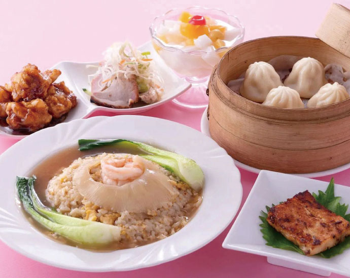 【迎春フカヒレセット】。特選フカヒレ姿のあんかけ炒飯、前菜二種、上海風黒酢入り酢豚、上海風小籠包、大根もち、杏仁豆腐のセット。