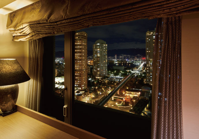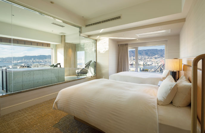 まずは上層階19階のクラブフロアに誕生した「クラブコーナービューバスツイン」を見学。この部屋の魅力はなんと言っても客室名にも冠されたビューバス(展望風呂)。神戸港と神戸市街地、そして壮大な六甲山の美しい稜線まで一望可能。六甲山から港を見下ろす視点とは真逆の、港から六甲山を望むという眺望もこの立地ならでは。昼は陽光に包まれた風景を、夜は「1000万ドルの夜景」とも称される神戸の街の煌めきを愉しめ、時間とともにガラリと印象を変える絶景に感動必至。さらにベッドからも六甲山の山並みを望めることができると聞けば、一日中ゆったりと客室におこもり…も断然ありな過ごし方。
