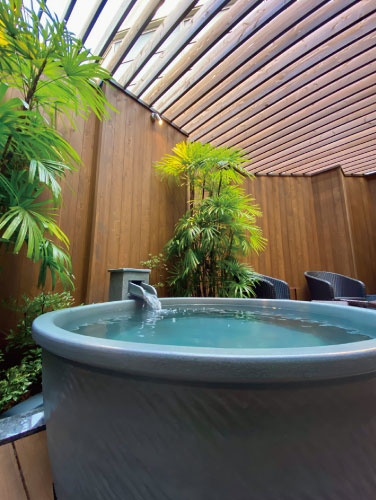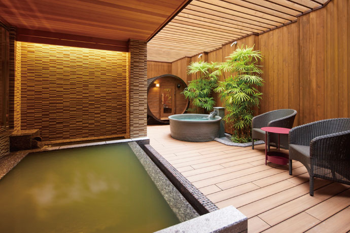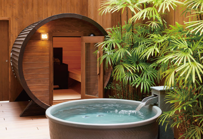 樽型のバレルサウナは好きなタイミングでロウリュが可能。水風呂はもちろん、露天風呂、さらにゆったりと外気浴を愉しめる広々とした屋外デッキテラスも完備。露天風呂では源泉かけ流し天然温泉の贅沢な湯浴みを満喫できるのが嬉しい。