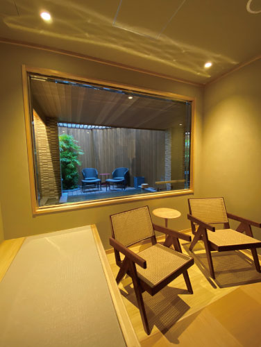 次に向かったのは、新客室のオープンより一足早く11月28日にオープンしたサウナ「永和凪」。ホテル敷地内の地下1600mから湧き出る自家源泉100%の温浴施設「濱泉」内にある、宿泊客専用のプライベートサウナ。人目が気にならない完全プライベートな空間で、自分だけのペースで「ととのう」体験ができる。