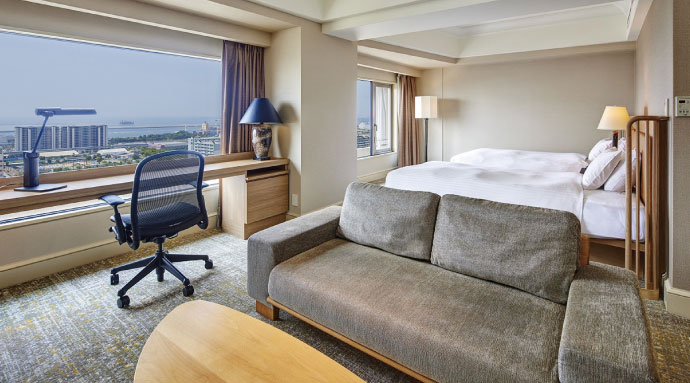 宿泊目的やターゲットに応じた機能を充実させた客室のリニューアルにも注目が集まる。新客室の「プレミアルーム」には、ウォークインクローゼットやIH対応ミニキッチン、冷凍・冷蔵庫、電子レンジを完備。神戸空港の国際化とIRの発展を見据え、インバウンド、アウトバウンドの長期滞在客の増加に備える。