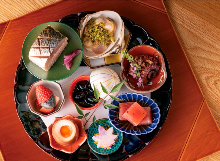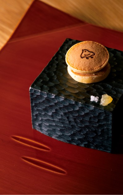 料理に既視感はある。が、視覚と味覚が錯覚を起こし、想像した味は別物へ昇華。イタリアンに和、洋、中を組み合わせ、これまで味わったことがないと感じさせるクリエーションを表現する。例えば、前菜の黒豆のエスプレッソ煮。見た目は完全におせちの黒豆、しかし口に含むと珈琲の香りが広がり、甘くほろ苦い余韻がなんとも妖艶。赤ワインとアンチョビやガーリック、オリーブで煮込んだ蛸の柔らか煮、シチリアの名産ピスタチオをソースに用いて芳醇な香ばしさを出した魚介の焼物、さらに箸休めで登場するスペシャリテのどら焼きも驚くばかり。自家製の甘い皮にカリッとキャラメリゼしたフォアグラをはさんで塩と自家製ジャムと共に食すなど、和と洋、異なる食材を融合させる手腕が見事。どれも長年培った確かな技術から生まれる唯一無二の味わいとなっている。肉料理に、レモン香る土鍋ご飯、〆めの抹茶チョコテリーヌまで、感動が途切れることはない。