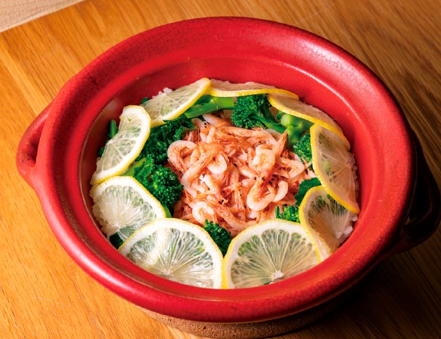 レモンが爽やかな桜海老の土鍋ご飯。2月はブリとイクラなど、旬の素材を使用したものに