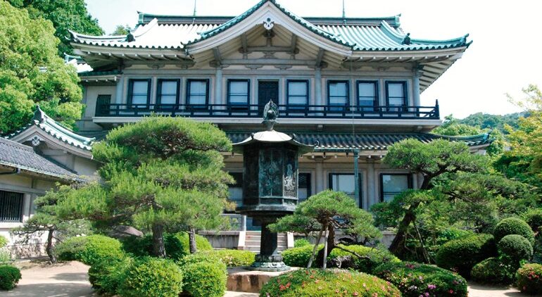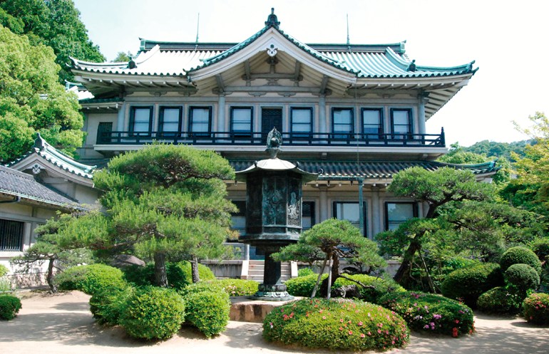 寺院建築風の本館。中庭中央の灯篭は、特注された東大寺大仏殿前の金銅八角灯篭の写し