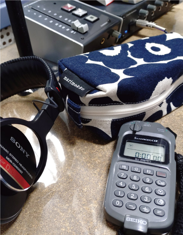 番組の収録風景。現場に持っていくお気に入りのポーチには、ストップウォッチと、のど飴を入れています!