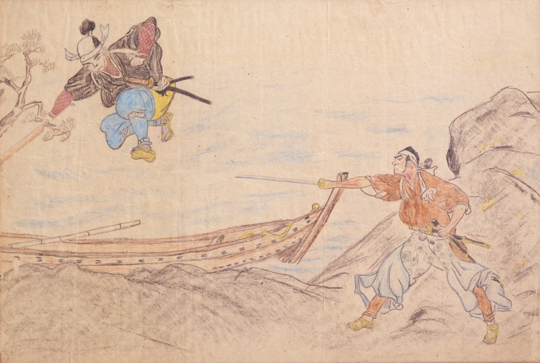 5歳の時に絵本「宮本武蔵」の挿絵、巌流島の決闘シーンを模写した作品