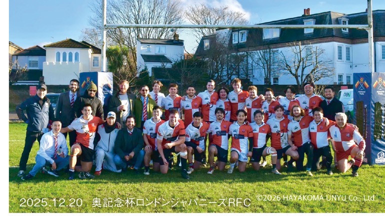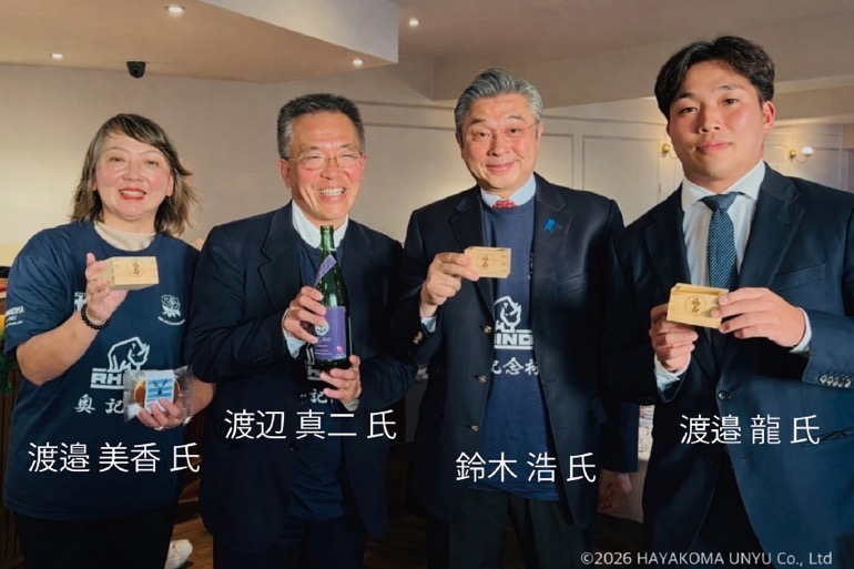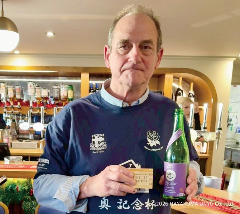 毎年大会を主催しているレジ・クラーク氏。平尾誠二氏がイギリス留学時代の親交が深かった。ラグビー及び教育を通じた日英間の友好親善への寄与により旭日双光章を受章されたレジ・クラーク氏。05年から英国で「奥記念杯」と名付けたラグビーの大会を開催し続けている。今年は、奥記念杯に早駒運輸がロンドンジャパニーズに渡邉龍が選手として招待されたことで「隧-ZUI-」3ケースと福寿木升100個を協賛としてロンドンへもっていく。