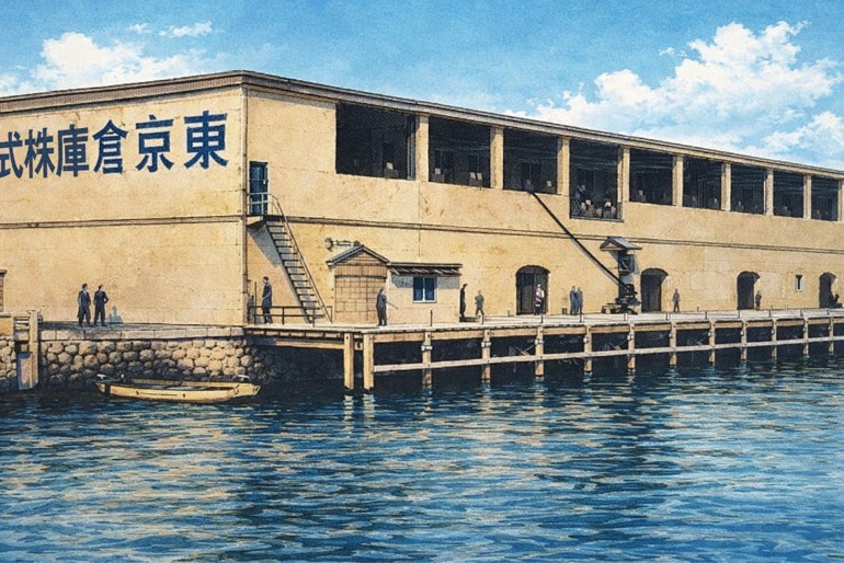 わが国初の多階建てRC造建築の和田ターミナル東京倉庫G号(モノクロ資料から描き起こしているため、カラーは想像です)