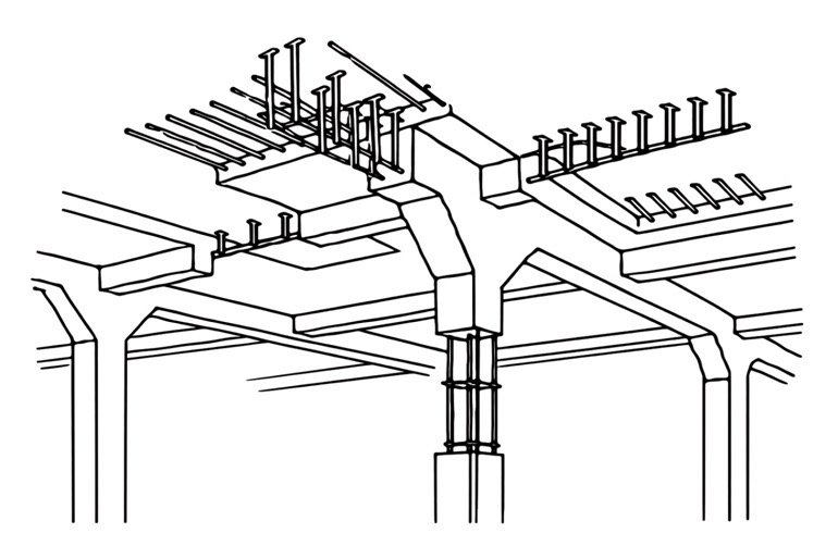 鉄筋コンクリートで柱、梁、スラブ(天井・床)を構造的に一体化させるアンネビック工法とその配筋の例