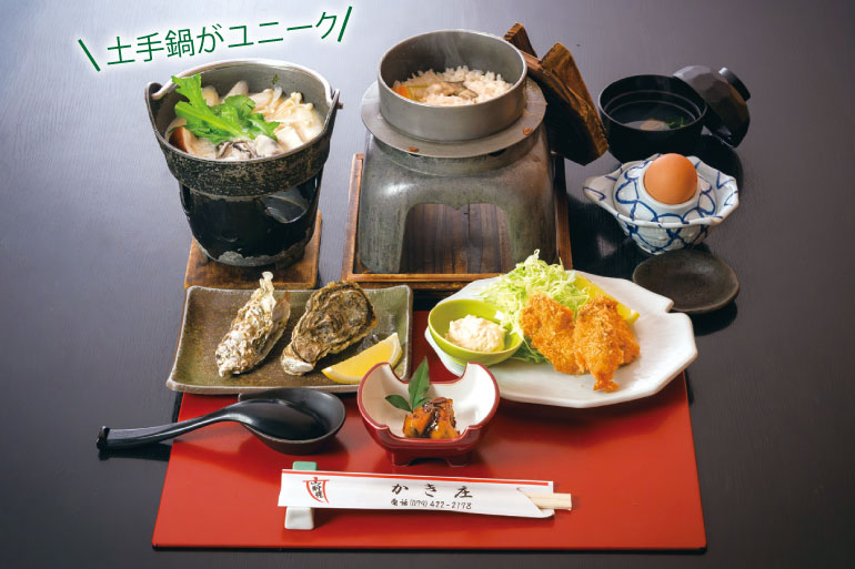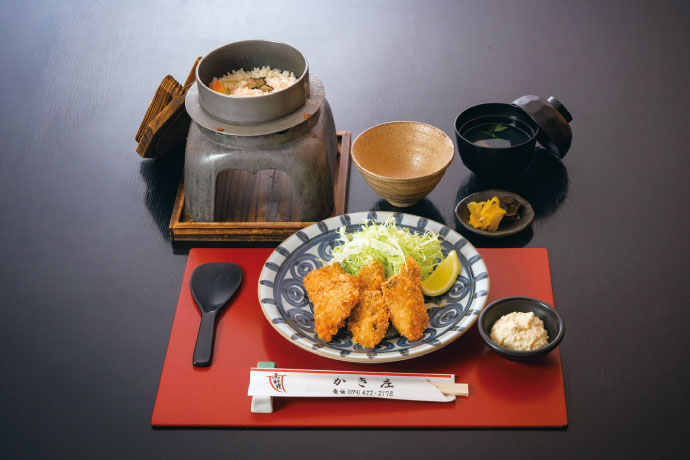 1926年(大正15年)、加古川に店を構え、今年で創業100年。地元で愛され続ける牡蠣料理専門店。冬は真牡蠣、夏は岩牡蠣と旬の牡蠣を日本各地から仕入れ、一年を通じて新鮮な牡蠣を味わうことができる。人気のランチメニュー「和 釜飯会席」は佃煮からフライ、殻付き焼きもの、土手鍋、釜飯、吸い物まで、牡蠣づくしの贅沢な内容。どれも格別な美味しさだが、注目したいのは土手鍋。ダシに「高松清太夫老舗」の白味噌を使用。まったりと濃厚な味噌をまとった大粒の牡蠣に溶き玉子を絡め、すき焼き風にして楽しむのが「かき庄スタイル」。プルンとした牡蠣と白味噌、玉子のコンビネーションに箸が止まらない!