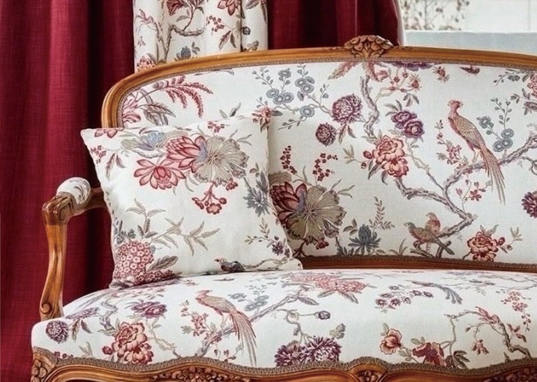 枝にとまる鳥と咲き誇る華やかな花々を繊細に描いた優雅なシノワズリーのデザインは、19世紀のヨーロッパで流行した装飾様式です。空間にクラシックな魅力と気品あるエレガンスをもたらし邸宅のような優雅な空間を演出します。カーテンから椅子張り生地として、上質なインテリアにふさわしいテキスタイルです。世界にひとつ、あなただけのインテリアをご提案させていただきますのでご相談ください。