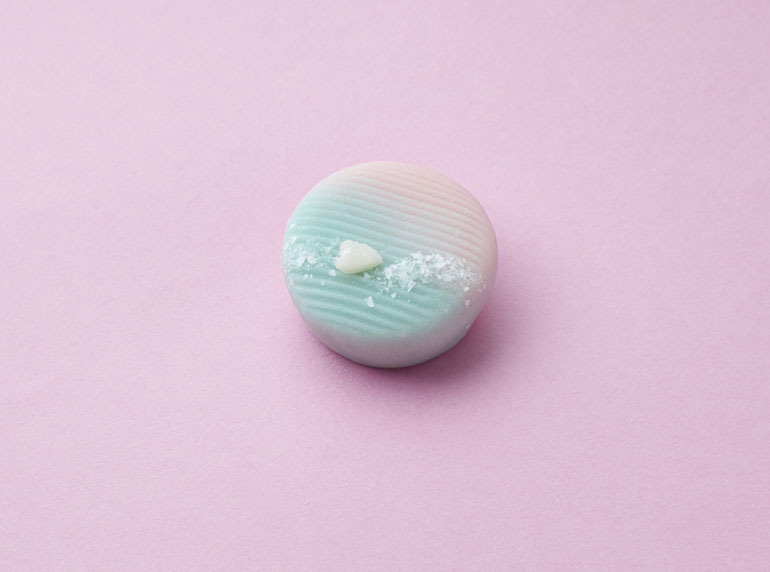 日本列島を春色に染める桜の季節。小川には散った桜の花びらが集まり、まるで筏のように川面を流れていきます。優雅に、麗かに。満開の桜と水の流れ、氷餅を細かく砕き花筏を表現してみました。
