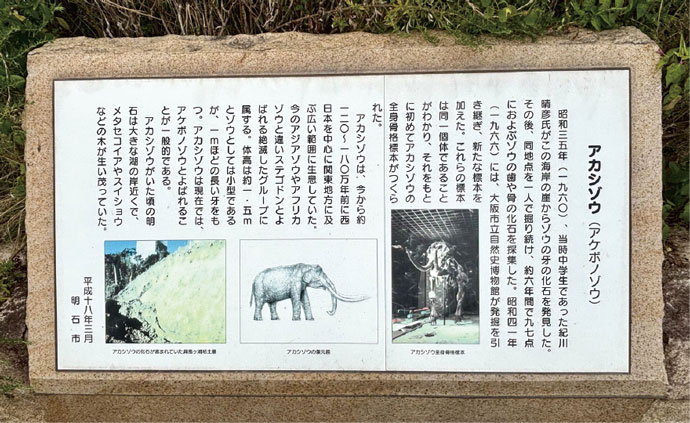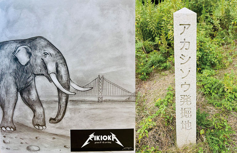 「この辺りには、かつてゾウがいた」幼少期、明石で玉子焼きを食べた帰りに祖父が教えてくれた。氷河時代、日本列島と大陸は陸続きとなり今では想像もつかない大型動物たちが生息していた。特にゾウ類は研究者により進化、渡来経路、時期が検証されており10種類以上は生息していたと言われている。中でも鮮新世から日本にいた「ミエゾウ」の子孫である「アカシゾウ」(正式名称:アケボノゾウ/時代:更新世前期/産地:兵庫県明石市沖瀬戸内海)は多くの化石が発掘されており明石市立文化博物館(兵庫県明石市上ノ丸2-13-1)には復元された全身骨格もある。昭和35年、後に古生物学の研究者となる紀川晴彦さんは中学生でありながら中八木海岸の崖からゾウの牙の化石を発見。その後、約6年間に渡り97点にもおよぶ歯、骨の化石を採集。青春時代の全てを発掘に捧げ120万年前の姿を蘇らせることに大きく貢献した。現在、その舞台となった海岸には石碑が建てられ古代の歴史ロマンを身近に感じることができる。現在でも明石海峡では漁船の網に化石が獲れるという。確かに大漁だが…まずは自治体や博物館に報告しましょう。