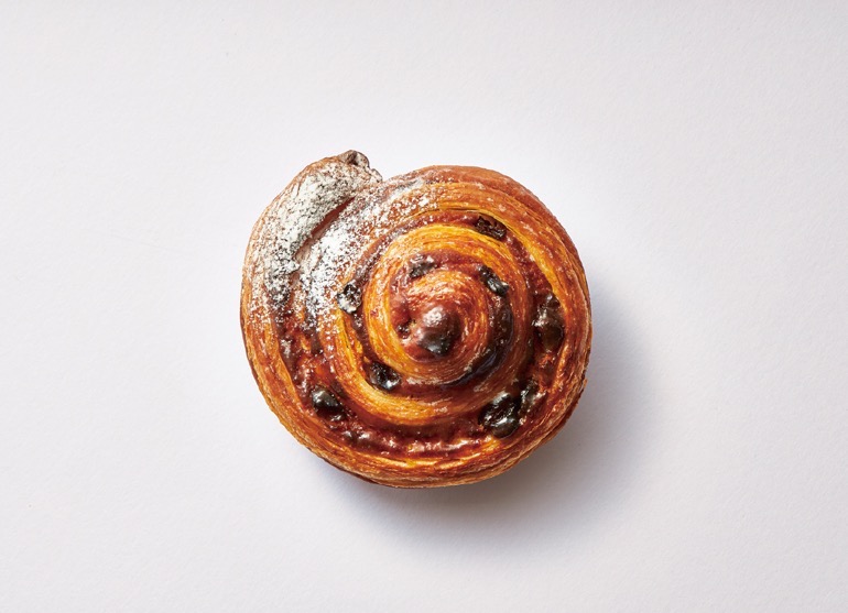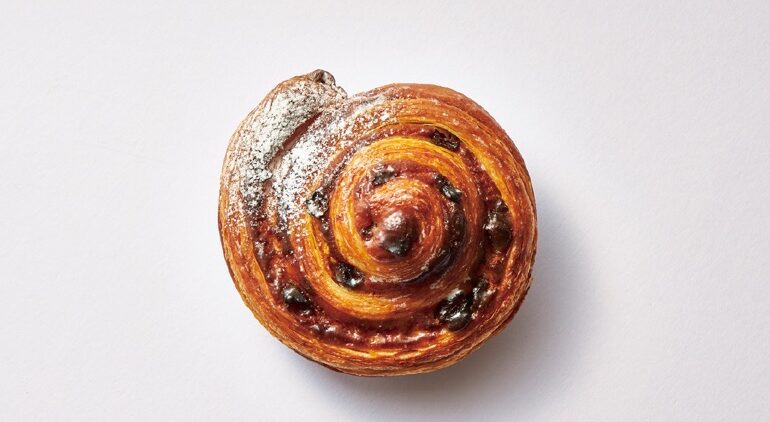 バターの香る贅沢なデニッシュ生地で、カスタードクリームとたっぷりの干し葡萄をロール。焼き上がりには表面に塗るシロップと粉糖で仕上げました。