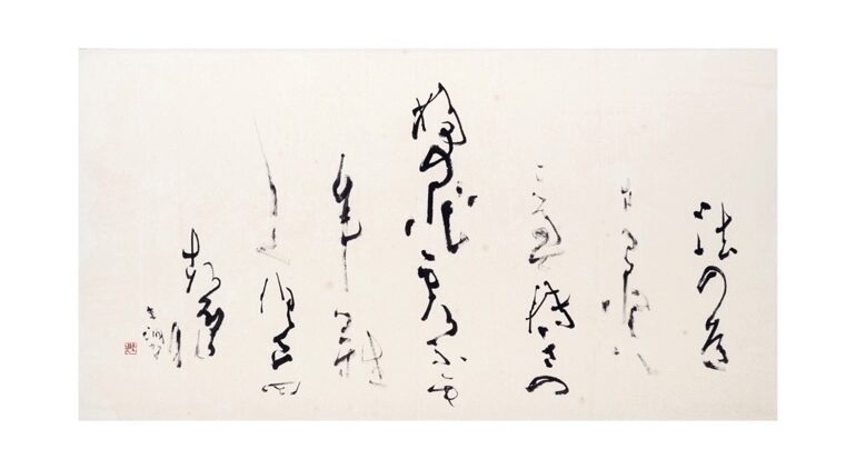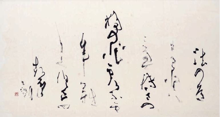 書の道に進み、日本人固有の美意識が生み出した「かな」の美に魅せられた井茂氏は「かな書」の第一人者となり、「散らし書き」は現代の美的感覚を備えた独創性豊かな作品として高い評価を受けています。1989年の兵庫県文化賞に続き1998年に神戸市文化賞を受賞。2003年に日本芸術院賞受賞、2012年には日本芸術院会員に就任します。2023年度の文化勲章を受章し、その翌年には卓越した功績に対して神戸名誉市民の称号が贈られました。2024年の第11回「日展」の「作家の言葉」のなかで「書線は心臓の鼓動の軌跡、呼吸の形象化である」と持論を語り、「落筆から筆を擱くまでの心のリズムを書線に封じ込め、鑑賞者に制作時の心の動きが直に的確に伝わるように努力した」と解説しています。