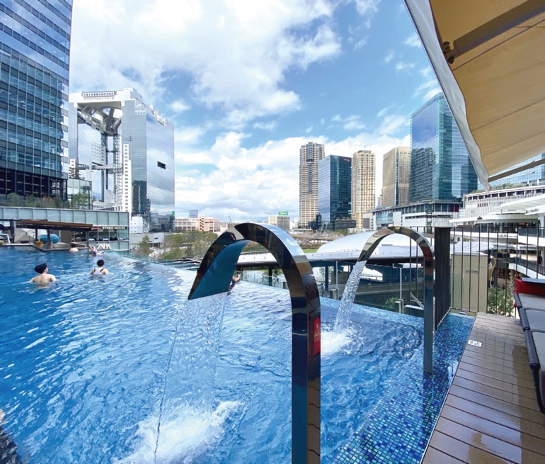 3月の平日、プレス招待日には午前中から50歳オーバーであろう、おばちゃん(失礼、私もその一人です…)が続々と来館。平日・土日共に利用状況は大きく変わらず、夕方以降は仕事帰りのOLや男性客も増えるという。当日、筆者はまず健康計測からスタート。体組成分析や自律神経データで心身の状態を把握し、そこからおすすめの施設やプログラムを体験していく。原稿執筆続きで運動不足の身ゆえ、最初に向かったのは筋肉負担が少ないプール。SNSなどで話題の『屋外温水インフィニティプール』は、うめきたエリアが一望出来る圧巻のロケーションで、ジャグジーやソファ、バーカウンターも完備。青空が気持ちいい日中はもちろん、夜はライトアップされて幻想的な雰囲気になるという。『屋内温水プール』には25mプールとジャグジー、リハビリにも活用できる水中マシンを備えたアクアジムがあり、水着サウナやバーも併設。バーではノンアルコールのヘルシーカクテルからアルコール、フードを堪能でき、すっかり極楽気分!