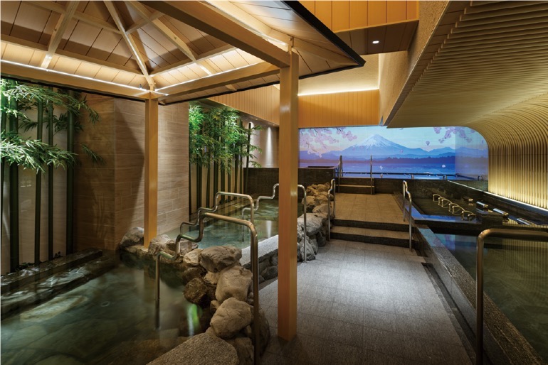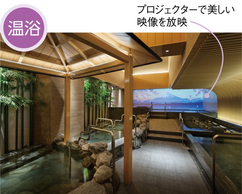 3Fの『大浴場』には、『神戸みなと温泉 蓮』から運ばれた天然温泉を堪能できる源泉風呂をはじめ、高濃度炭酸泉、柚子や菖蒲など季節の移ろいを感じる二十四節気湯、富士山や桜がプロジェクトマッピングで映し出されるディープスパ、人間工学寝湯(バブルベッド)など、多様な湯船がズラリ。取材であることを忘れてしまうほどの充実ぶりだ。男女共にサウナ完備で、“ととのう”環境も申し分なし。人気熱波師によるアウフグースイベントも定期的に開催されているという。オプション料金追加で『岩盤浴・溶岩浴』も利用でき、美容や健康効果をより高めることが可能。入浴後のパウダールームには、人気ブランドの最新ドライヤーやアイロン、アメニティが完備され、ツルピカ&快適な湯上りタイムをサポートしてくれる。