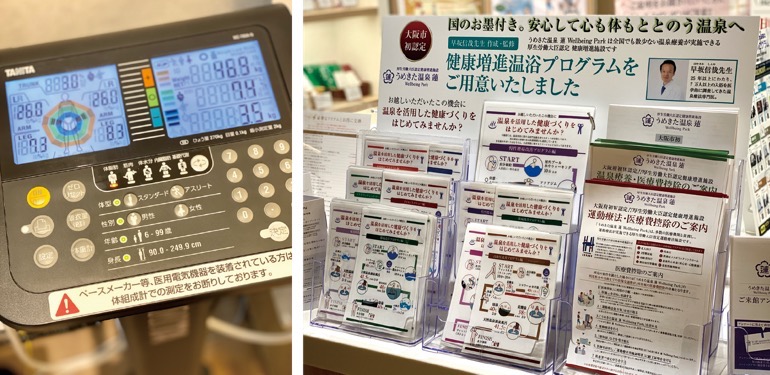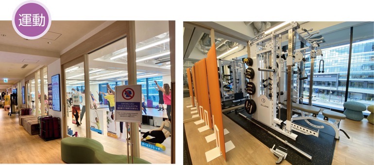 大阪市初で「温泉利用型健康増進施設」「運動型健康増進施設」のW認定を受けた点も特徴。3Fの『フィットネスコーナー』では、ヨガやズンバ、ボクシングなど多彩なレッスンを受講でき、マシンピラティスをはじめ最新マシンを揃えたフィットネスジムやバイクエクササイズなど、幅広い運動が可能。目的や筋力、体型にあわせてマシンが負荷やペースを自動調整してくれる『AIサーキットトレーニングシステム』も導入されており、初心者でも無理なく効率的にトレーニングできる。