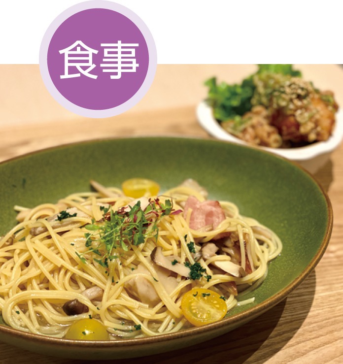 きのこと香ばしベーコンの塩麹パスタ。メニュー表に記載された栄養などの説明もためになる