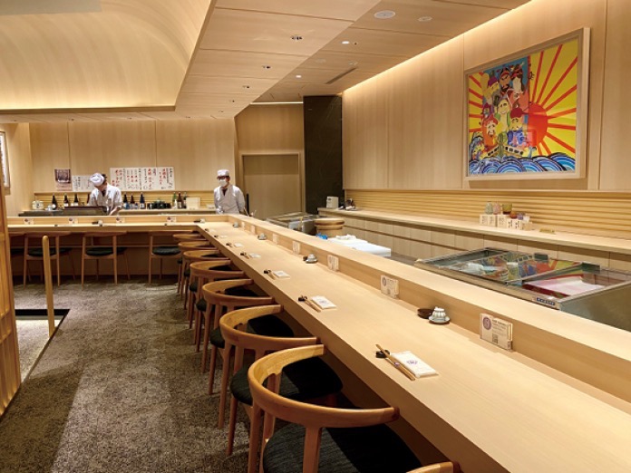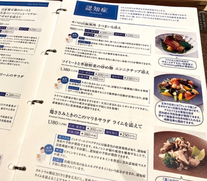 館内の食事処は2つ。『御食事処 発酵道 水蓮』では、京都の老舗「菱六」の麹を使った発酵食中心の健康メニューを、カウンター席を備える『御食事処 ライブ割烹 万蓮』では、職人が目の前でにぎる鮨なども味わえる。ガッツリ系のサウナ飯から低脂肪・低糖質のおでん、パスタ、ラーメン、神戸で人気の「ル・パン」のスイーツまで多彩。美容・ダイエット・疲労回復等、目的別におすすめの健康促進メニューが羅列されているのもユニーク。なかにはDHAやEPAが豊富な青魚を使った鯖の山椒風味など、認知症防止に役立つ美味しそうな料理も並ぶ。