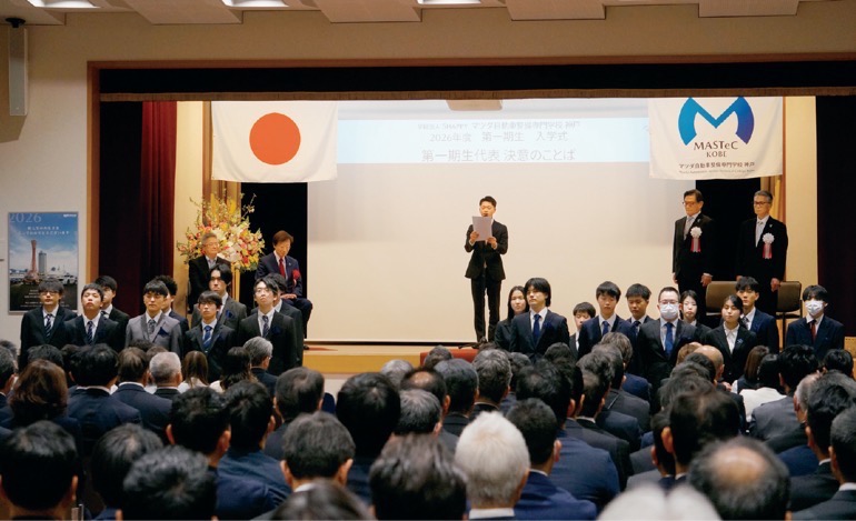 そしてMASTeC KOBEのバッジやエンジニアウエアを授与された輝かしき第1期生を代表し、渡邊孟成さんが「第1期生として、私たちの背中を見て学ぶ後輩たちの模範となれるように」と決意の言葉を述べると、教職員たちが壇上に立ち、鳥羽祐一朗先生が「失敗を恐れる必要はありません。ともに挑戦し、ともに踏み出し、ともに進んでいきましょう!」と歓迎。明るいメロディーと希望に満ちた歌詞の校歌も披露され、最後は少し緊張した面持ちで新入生たちは退出し、誇りある職業への道の第一歩を刻んだ。