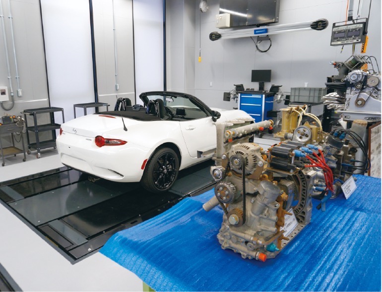 真新しい校舎には、教材となる自動車や部品なども充実。中には山本校長がマツダミュージアムから取り寄せたル・マン24時間耐久レース用のエンジンも