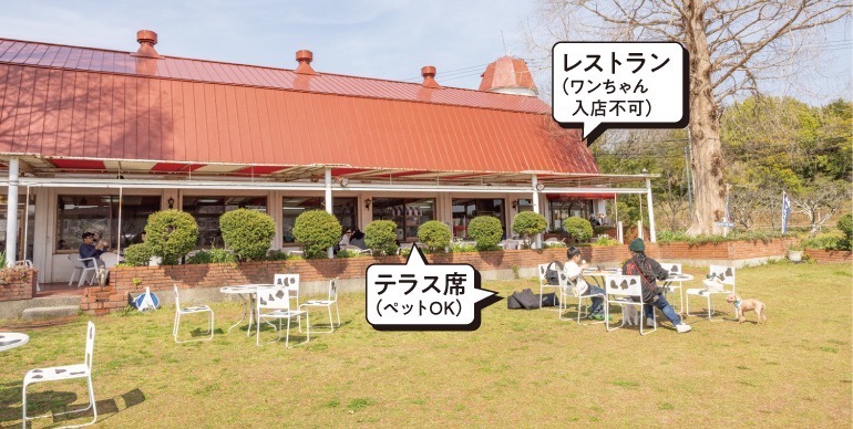 レストランは創業当時牛舎だったところを再利用。テラス席(40席)はペット同伴OK