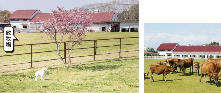 ジャージー種の乳牛を百頭余り飼育する放牧場は、柵の外側からペット同伴で自由に見学できる