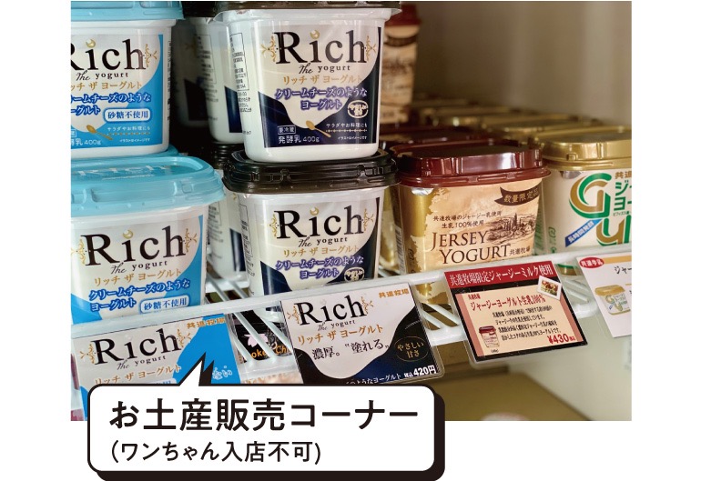 レストラン内のお土産販売コーナーには「まるでクリームチーズのよう!」SNSで話題の「リッチザヨーグルト」など、共進牛乳の人気商品も豊富に揃う