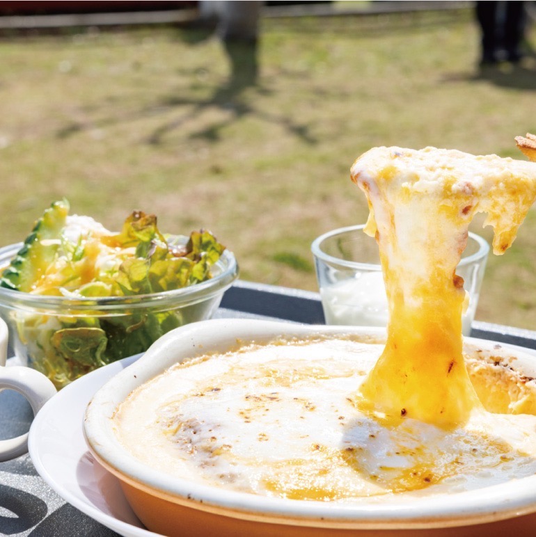 小野市にある1890年創業の老舗「共進牛乳」が運営する共進牧場。全国でも希少なジャージー牛の飼育や放牧風景が楽しめる牧場敷地内に、もともと牛舎だった建物をリフォームしたレストランも併設。のどかなロケーションのなか、ジャージー牛の新鮮なミルクをたっぷり使った、牧場ならではのメニューを提供する。イチオシは、「五つ星ひょうご」にも選ばれた「極上ジャージープリン」。生キャラメルのような濃厚な2種類のソースを使った3層仕立てのプリンで、食べるたび違った味と出会える。またミルクを練りこんだ生地に自家製リコッタチーズをトッピングしたピザや、プレミアムジャージーソフトクリームも大人気。