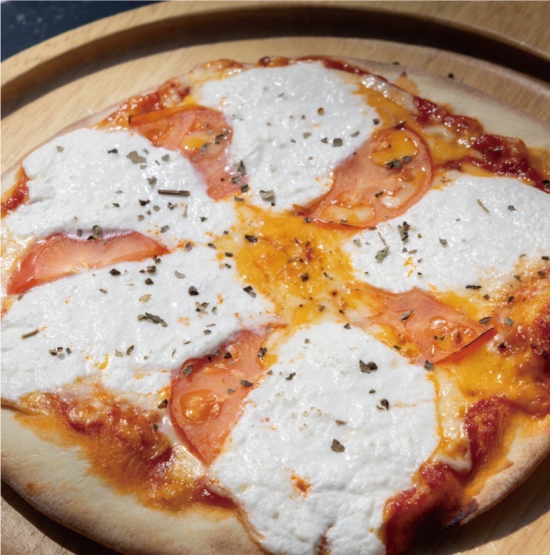 ミルクでこねるピザ生地に自家製リコッタチーズが絶妙な「ピザ マルゲリータ1,200円」。マヨポテピザやシェフのきまぐれピザなど、ピザは全3種