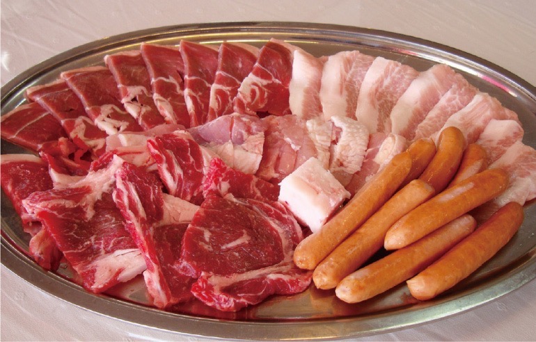 「ミルカーズ創業30周年記念5種盛り合わせBBQ1人前3,200円」。兵庫県産但馬牛やラム肉、鶏肉、豚肉、ウィンナー等、5種類の肉と野菜、ご飯のセット。予約がベター ※写真はイメージ