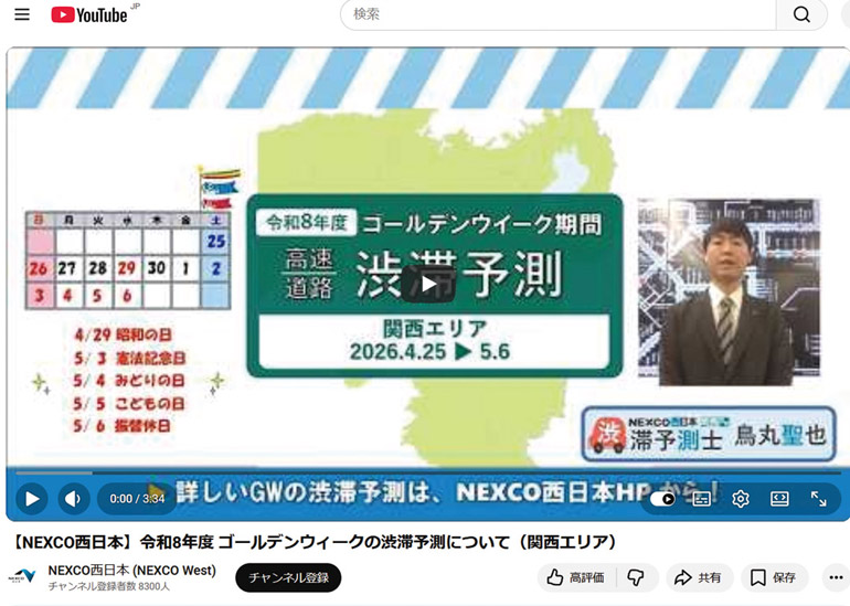 NEXCO西日本では、「YouTube公式チャンネル」や「渋滞予測ガイド(iHighwayからもアクセス可能)」で、GWやお盆などの高速道路の渋滞予測を配信。渋滞が予測される日や時間帯をずらすなど計画的なお出かけを!