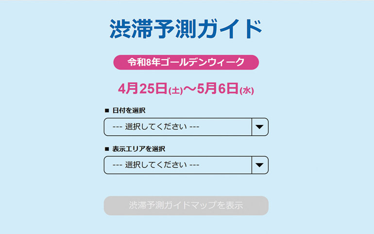 GWやお盆などの交通混雑期は「渋滞予測ガイド」、普段の渋滞予測は「渋滞予測カレンダー」をチェック!