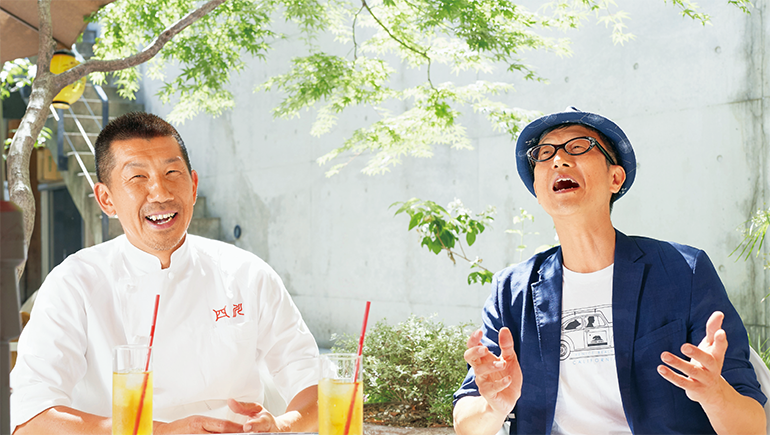 平田健太郎さんとテラス席にて。話をしていると同じ中学の後輩と判明。校歌をうたう銀瓶さん。「よく覚えてますね」「小学校の校歌も歌えます」ともう1曲